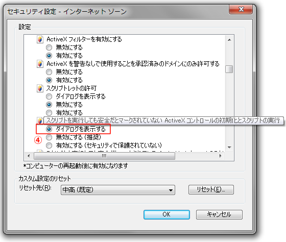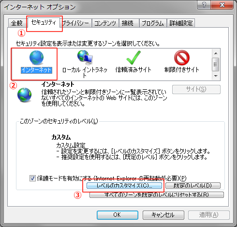 インターネットオプションのセキュリティ設定